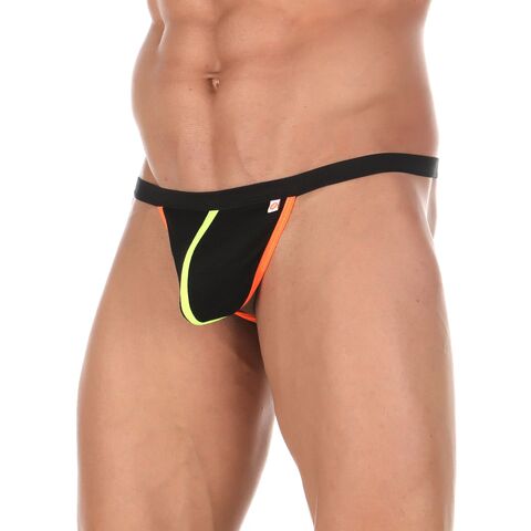 Черные сексуальные трусы-стринги с оранжевой и салатовой окантовкой