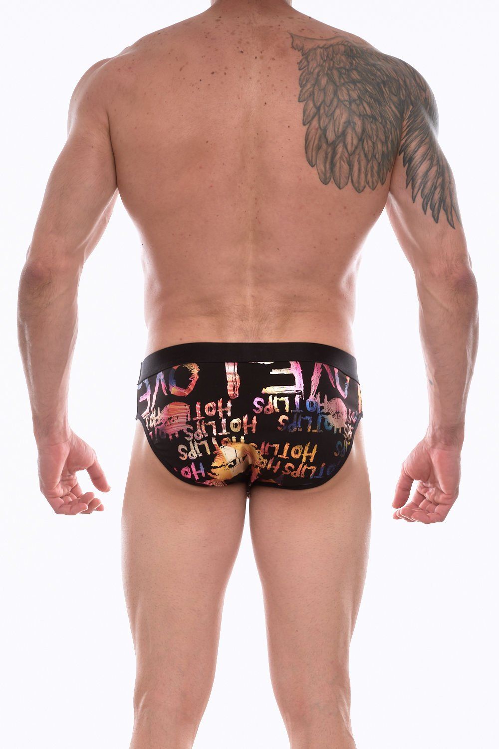 Черные трусы-брифы с блестящим принтом в виде надписей и губ.