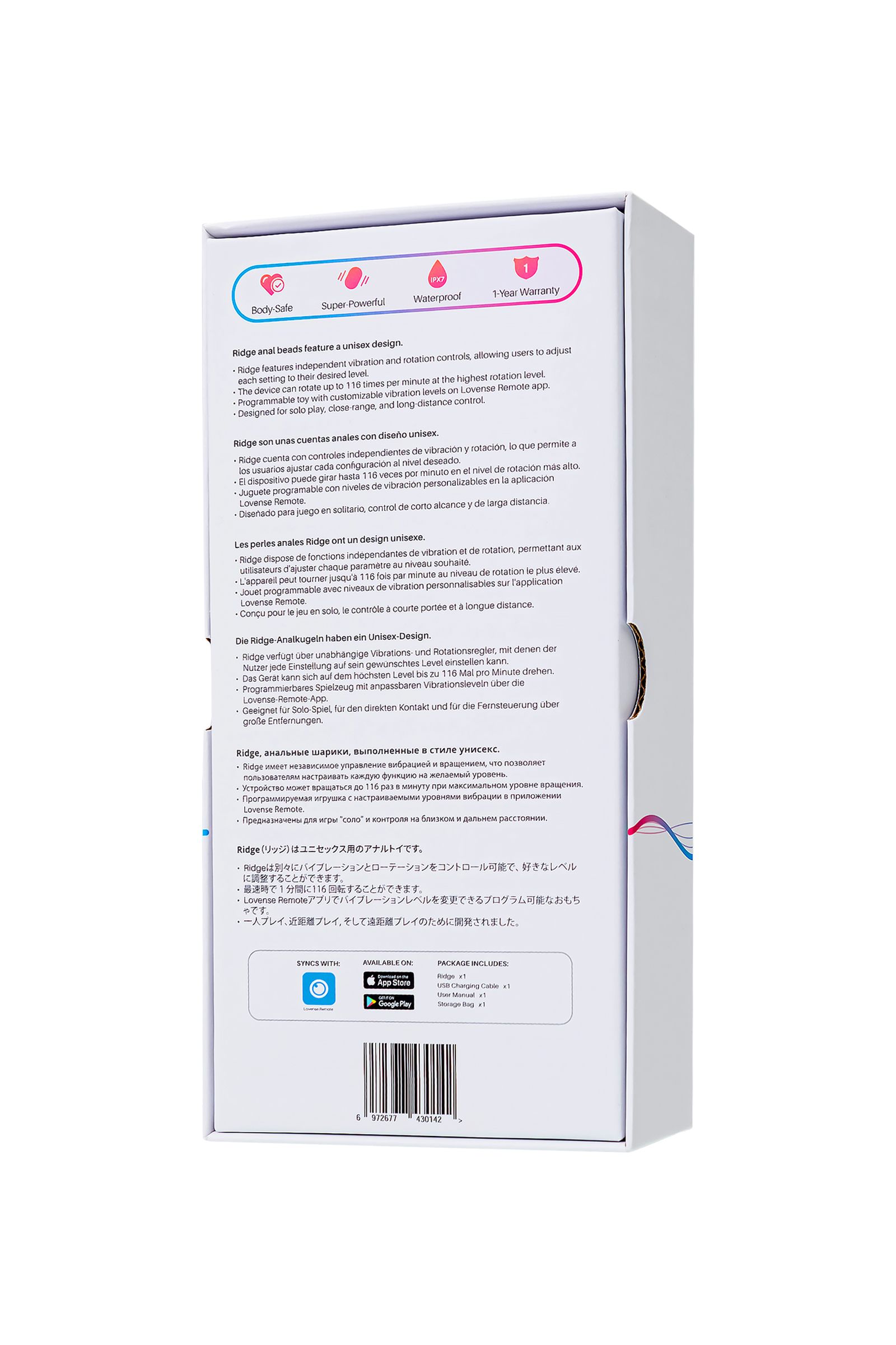 Мощный мотор обеспечивает интенсивные вибрации при низком уровне шума, обеспечивая максимальную дискретность. Миниатюрные шарики легко вводятся и извлекаются, позволяя вам постепенно увеличивать уровень комфорта и уверенности. Диаметр шариков постепенно расширяется к основанию. Ridge также обеспечивает дополнительную стимуляцию эрогенных зон, увеличивая удовольствие.