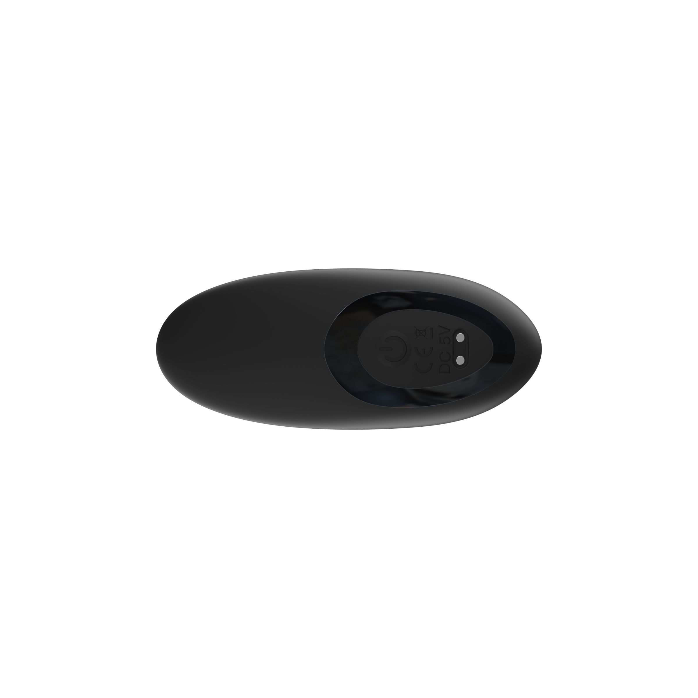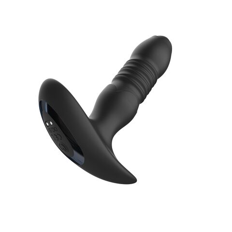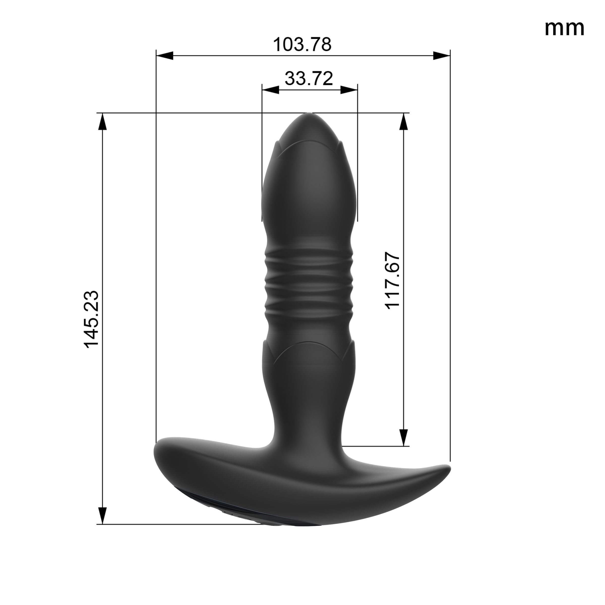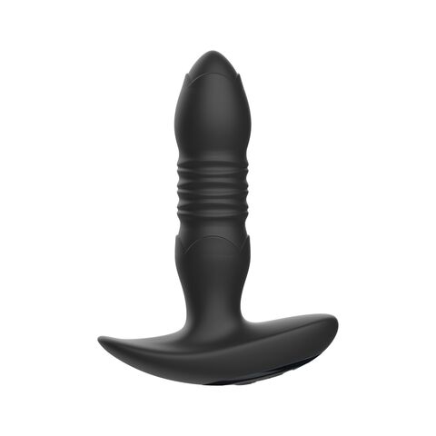 Черный анальный вибромассажёр с 10 режимами возвратно-поступательных движений. Режимы управляются при помощи пульта ДУ. Магнитная зарядка. Рабочая длина - 11,8 см.