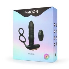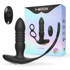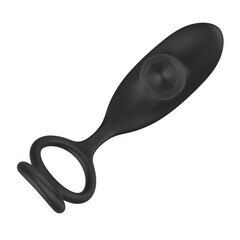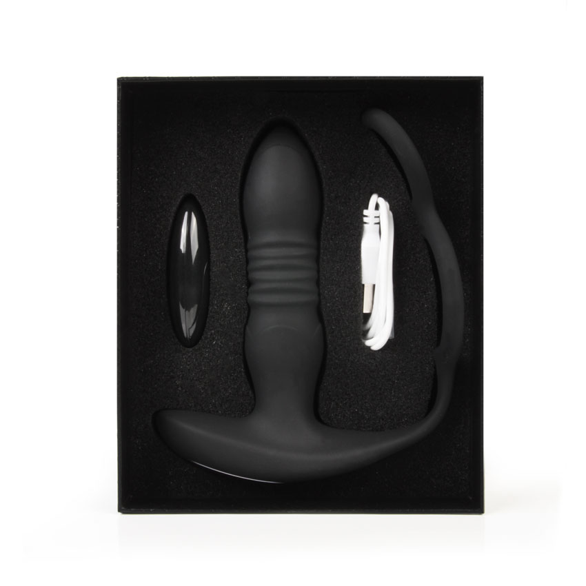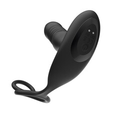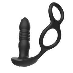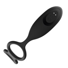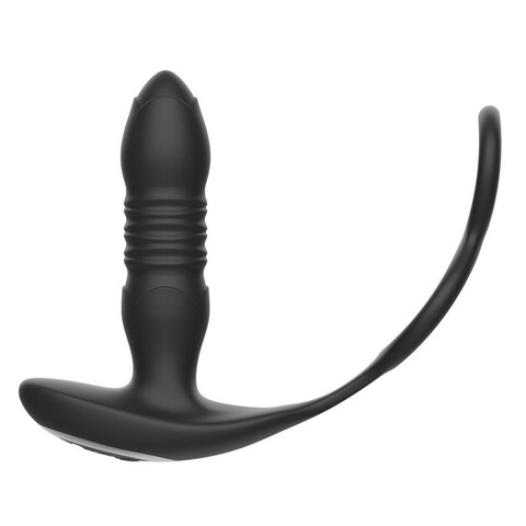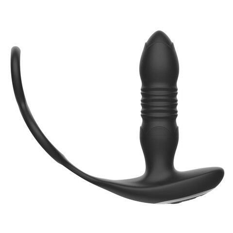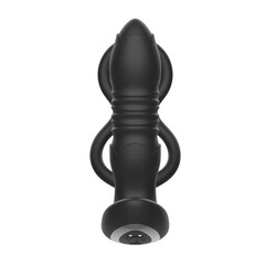 Черный анальный вибромассажёр с возвратно-поступательными движениями и кольцами для фиксации. 10 режимов возвратно-поступательных движений. Пульт дистанционного управления. Рабочая длина - 11,3 см.