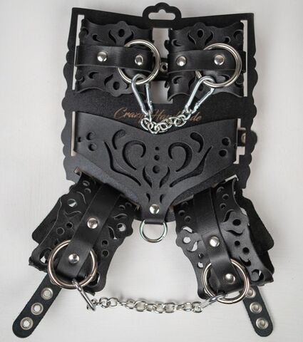 Наручники с авторским дизайном из натуральной кожи со стальным хромированным кольцом. Резные элементы придают атмосферу нежности, элегантности и подчеркивают красоту тела. Регулируются ремешком из натуральной кожи. В комплекте прочная соединительная цепочка с двумя карабинами.