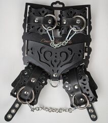 Оковы с авторским дизайном из натуральной кожи со стальным хромированным кольцом. Резные элементы придают атмосферу нежности, элегантности и подчеркивают красоту тела. Регулируются ремешком из натуральной кожи. В комплекте прочная соединительная цепочка с двумя карабинами. Длина ошейника - 44 см, ширина - 9 см, обхват - 32-41 см.