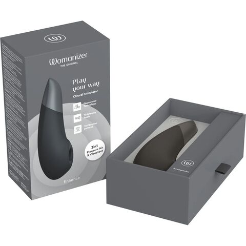 Первый клиторальный стимулятор Womanizer, сочетающий вибрацию We-Vibe и технологию Pleasure Air для усиления ощущений. Раздельные моторчики позволяют использовать эти виды стимуляции вместе или по отдельности, чтобы разнообразить ваше путешествие. В вашем распоряжении 10 уровней интенсивности Pleasure Air, 10 уровней мощности вибрации и 10 режимов вибрации, которые регулируются индивидуально, - более 1000 способов получить удовольствие с Womanizer Enhance. Переключать режимы для обоих видов стимуляции возможно вместе и или по отдельности, благодаря кнопкам на корпусе. Полный заряд достигается за 2 часа и обеспечивает до 120 минут работы моторчиков. Этот вибратор имеет более широкую интегрированную головку, которая стимулирует большую площадь поверхности, усиливая ощущения. Корпус покрыт мягким шелковистым силиконом, не содержит токсичных веществ и безопасен для кожи человека. Womanizer Enhance полностью водонепроницаем, поэтому подходит для игр в ванной или душе.