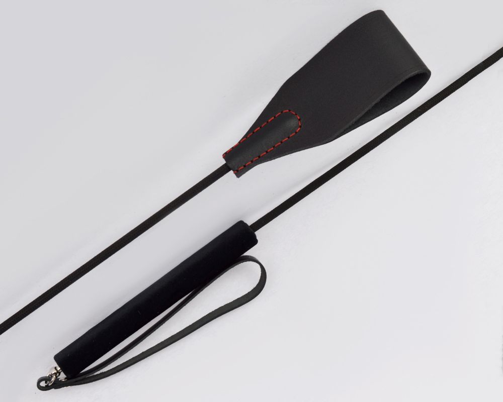 Стек состоит из жесткой рукояти, гибкого полимерного хлыста и хлопушки из натуральной кожи. Декорирован контрастной строчкой.