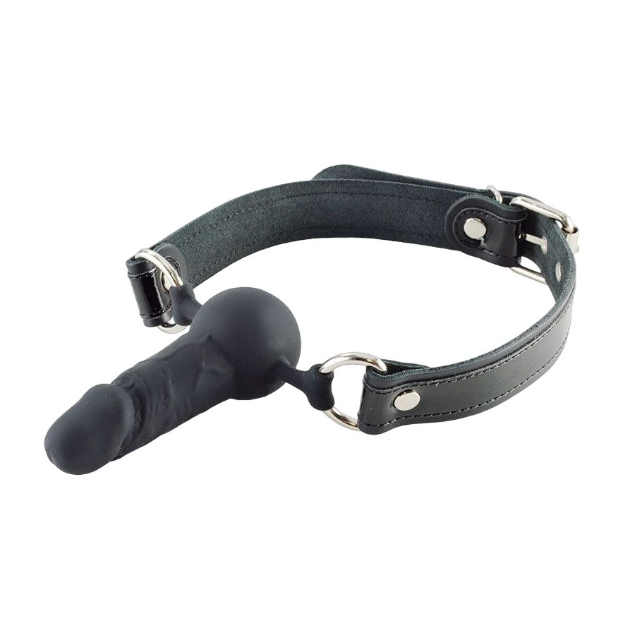 Черный кляп-шар с фаллосом на кожаных ремешках