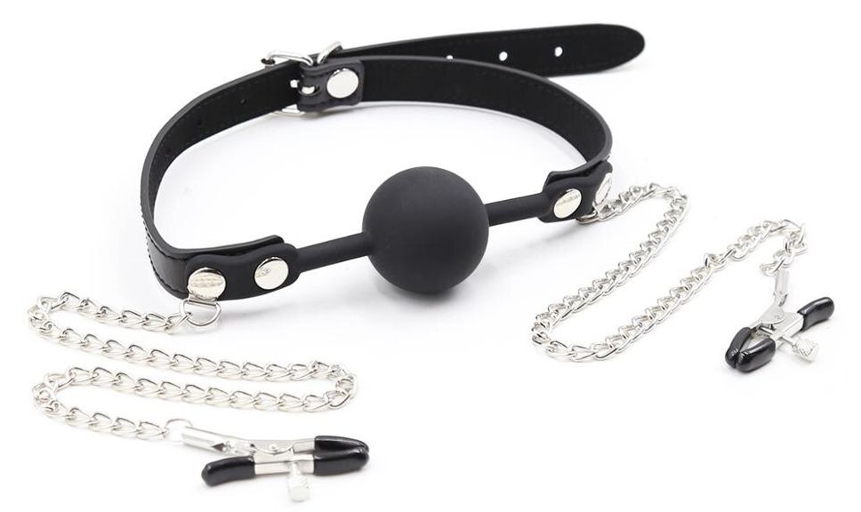 Черный кляп-шарик с зажимами на соски на металлических цепочках