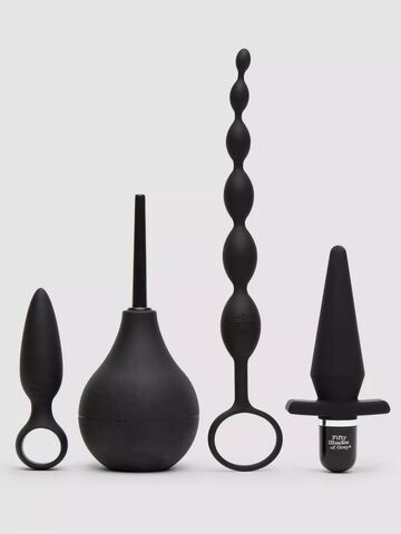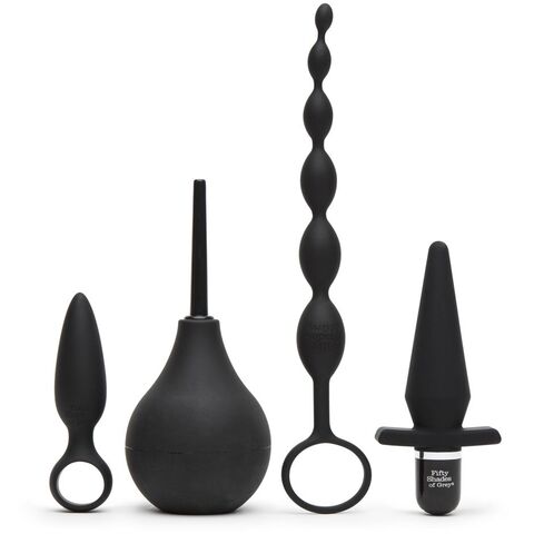 Черный набор для анальных игр Take it Slow. Состоит из анальной пробки с ручкой-кольцом, анального душа, анальной цепочки и вибропробки. Длина анальной пробки - 10,8 см, диаметр - 2,2 см.