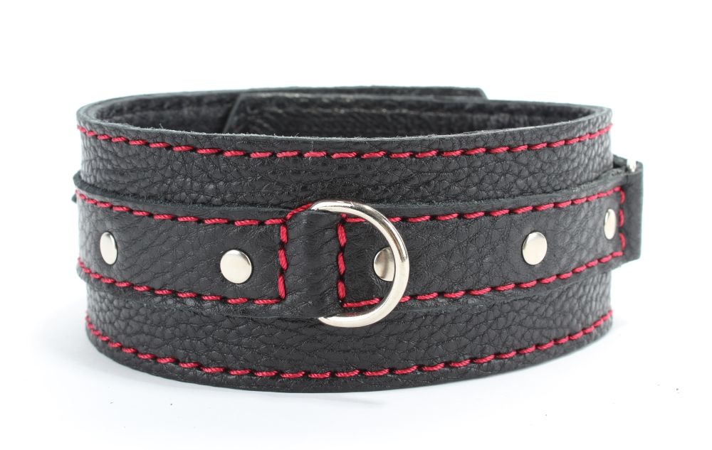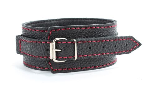 Ошейник выполнен из качественной натуральной кожи, мягкий и комфортный в использовании. Декорирован заклепками и яркой красной строчкой. Ремень сзади позволяет выбрать нужный размер, подойдет на обхват от 30 до 40 см. Металлическая пряжка надежно фиксирует аксессуар. Подклад выполнен из нежной перчаточной кожи. Стильный ошейник поможет воплотить эротические фантазии в реальность. Ширина - 5 см.