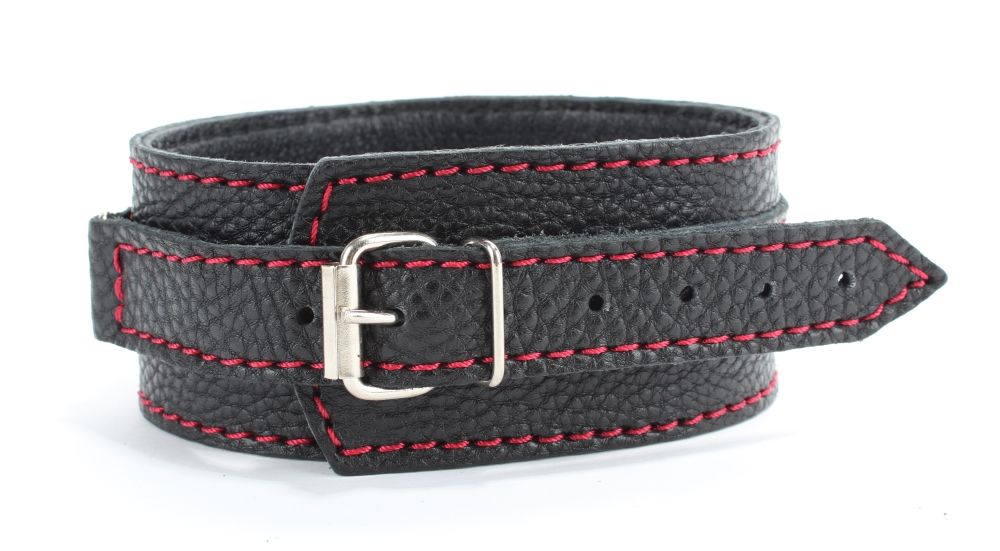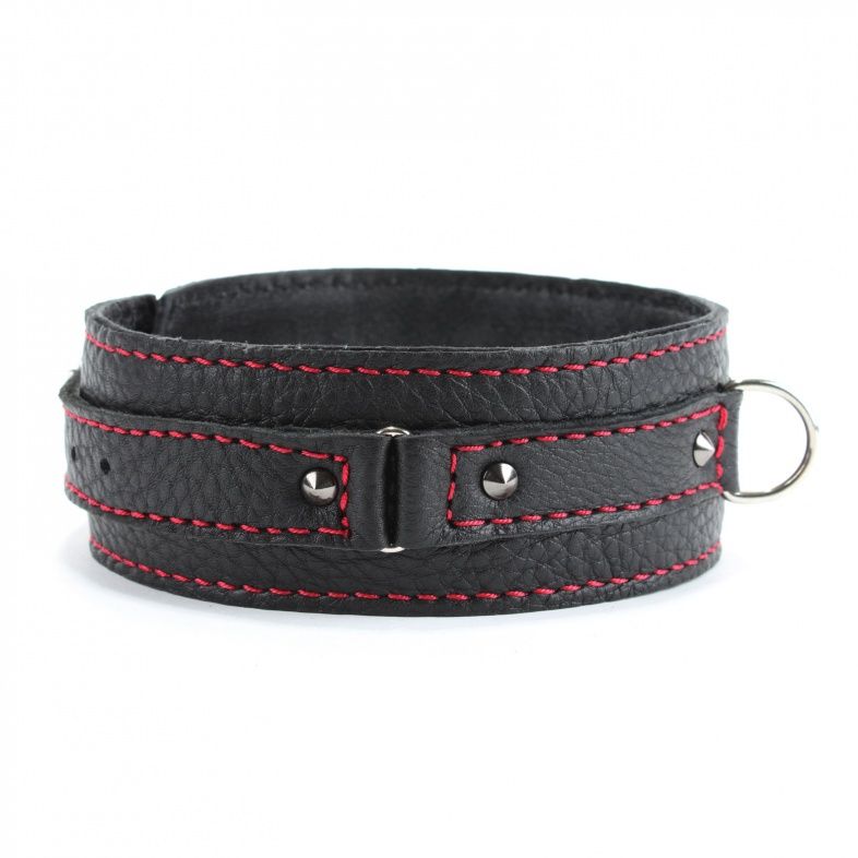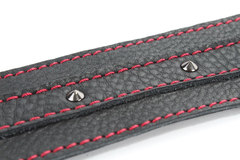 Ошейник выполнен из качественной натуральной кожи, мягкий и комфортный в использовании. Декорирован шипами и яркой красной строчкой. Ремень сзади позволяет выбрать нужный размер, подойдет на обхват от 30 до 40 см. Металлическая пряжка надежно фиксирует аксессуар. Подклад выполнен из нежной перчаточной кожи. Стильный ошейник поможет воплотить эротические фантазии в реальность. Ширина - 5 см.