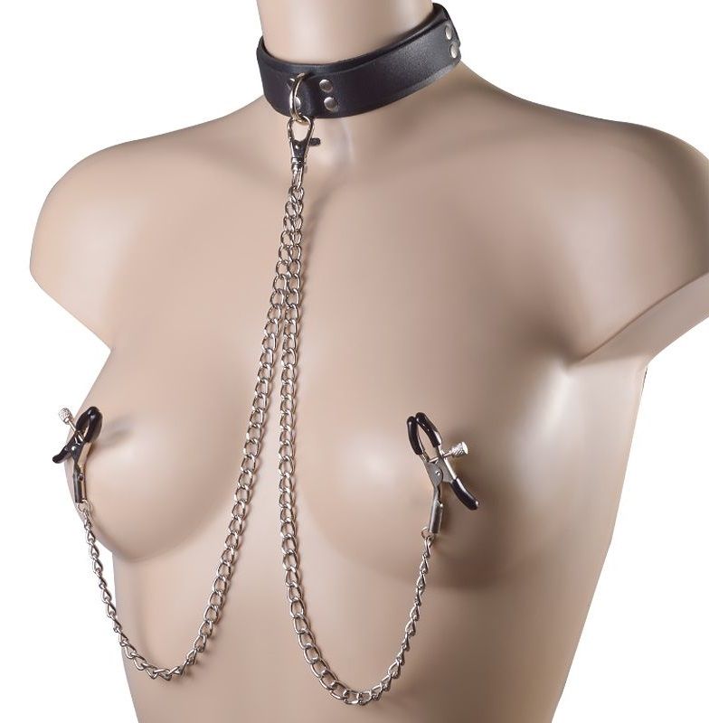 Ошейник с зажимами на соски изготовлен из натуральной кожи с применением никелированной фурнитуры, декорирован клепками. Регулируется ошейник при помощи пряжки, что позволяет оптимально подобрать размер. Зажимы оснащены пружинным механизмом, за счет чего легко и удобно фиксируются на месте, винтики позволяют отрегулировать степень давления в соответствии с индивидуальными предпочтениями. Поводок кожаный. Ширина ошейника - 3 см.