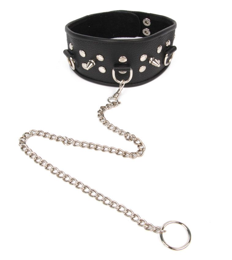 Черный ошейник с шипами и металлическим поводком-цепочкой
