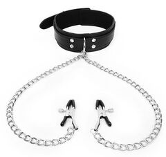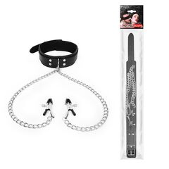 Оригинальный интимный аксессуар для любителей БДСМ-игр состоит из удобного ошейника и металлических зажимов для сосков, соединённых с ошейником прочными металлическими цепочками. Ошейник выполнен под кожу, имеет возможность регулировки размера. На концах зажимов находятся специальные эластичные накладки, которые препятствуют сильному сдавливанию и травмированию сосков. На каждом зажиме предусмотрен регулировочный винт, позволяющий контролировать силу сдавливания. БДСМ-аксессуар прост в применении, не требуют специального ухода.