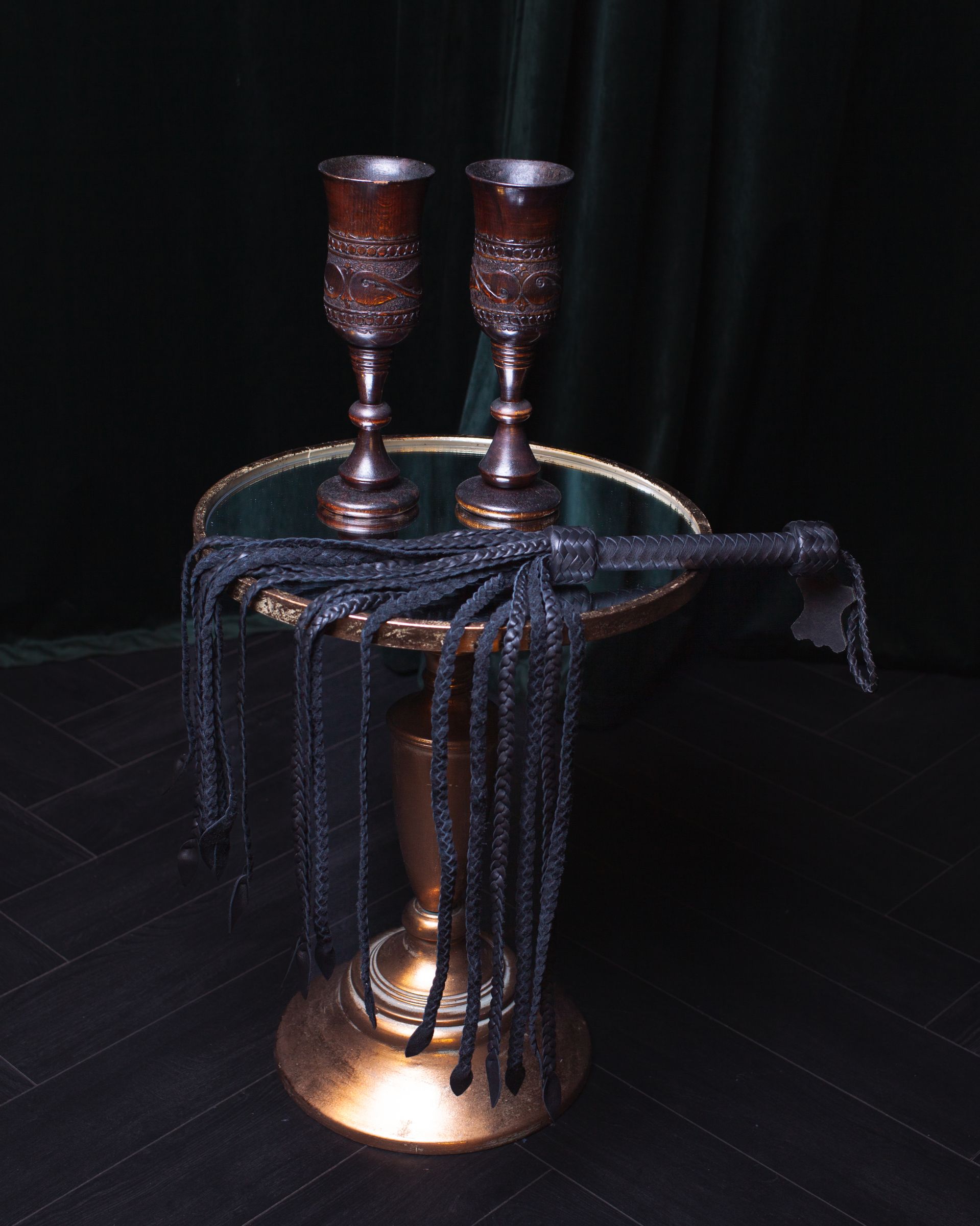 Роскошный плетеный флоггер из натуральной кожи премиум качества. На кончиках хвостов находятся мягкие лепестки. Флоггер имеет удобную рукоять с петлей для фиксации изделия на запястье. Флоггер подходит для БДСМ практик, игровых наказаний, и для болевого воздействия. Для того, чтобы можно было рассмотреть вид и качество товара, он упакован в прозрачный пакет. Длина ручки - 24 см.