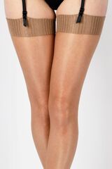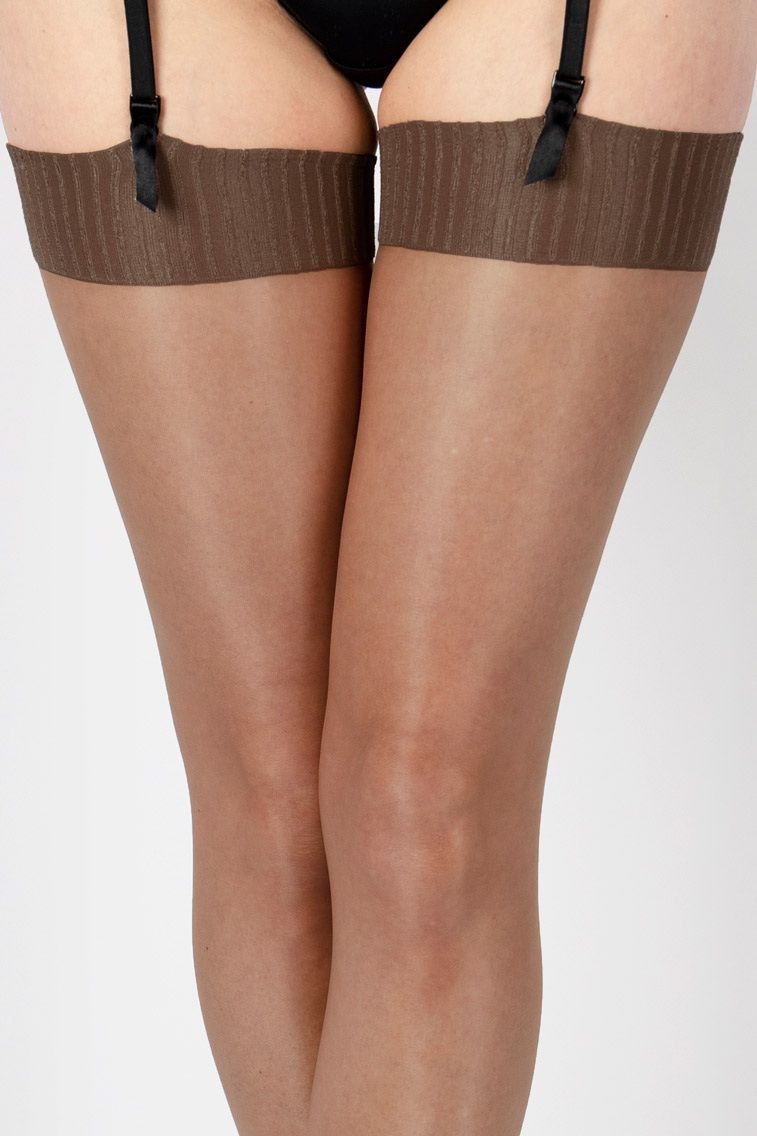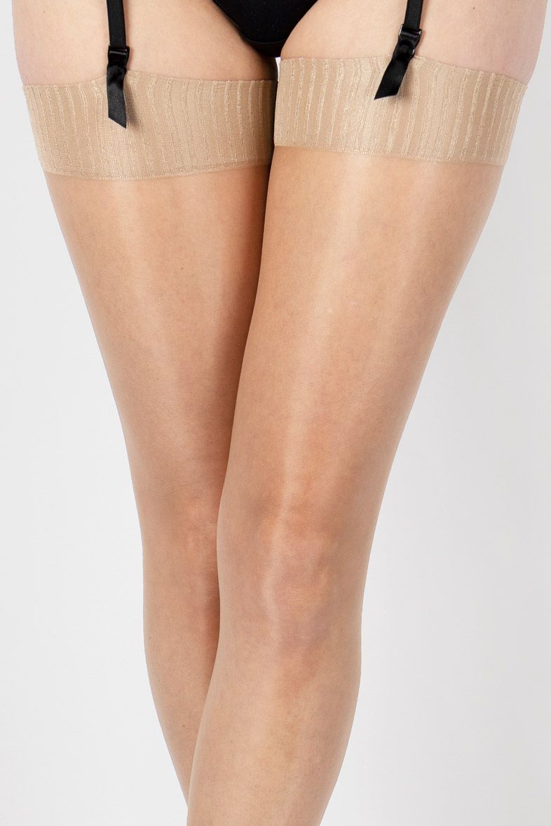 Чулки под пояс с блеском, верх чулка в рубчик, полностью сформированные, прозрачный мысок. Плотность - 10 ден.