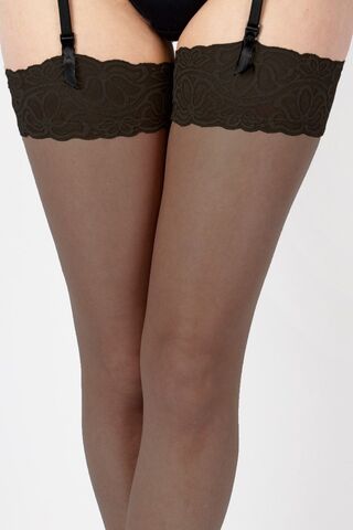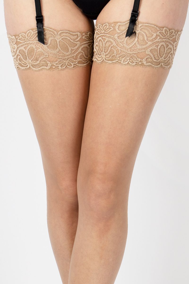 Чулки полублестящие под пояс, с широким кружевом , полностью сформированные, прозрачный мысок. Плотность - 10 ден.