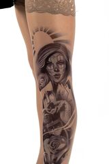 Чулки выдержат многочисленные стирки со стиральным порошком. При этом принт не сотрется и не выгорит, смотрится как настоящая татуировка. Плотность - 40 ден.