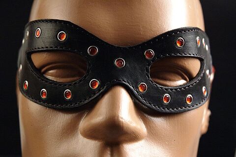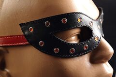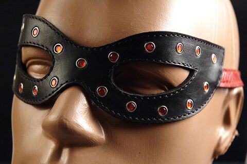 Лаковая черная кожа, прорези для глаз, красные стразы по контуру, застежка красный ремешок с пряжкой.