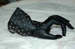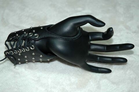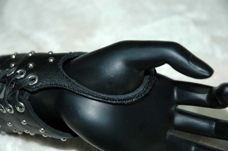 Защита для запястья выполнена из натуральной кожи и украшена металлической фурнитурой. Шнуровка на внутренней стороне выполняет функцию застежки. Идеально подходит как мужскому, так и женскому полу.