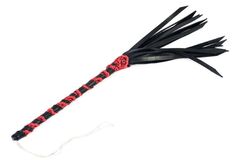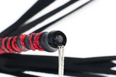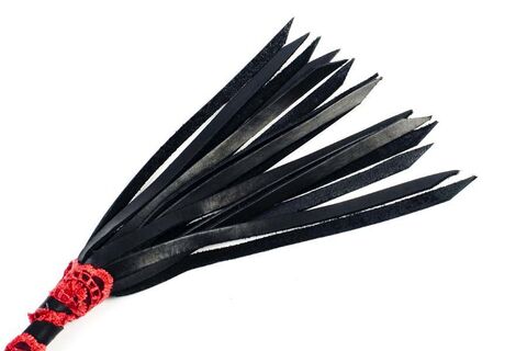 Длинная тонкая ручка, обмотанная кожаной полосой с красными кружевами, петлей-цепочкой для фиксации руки и с 16 хвостами.