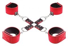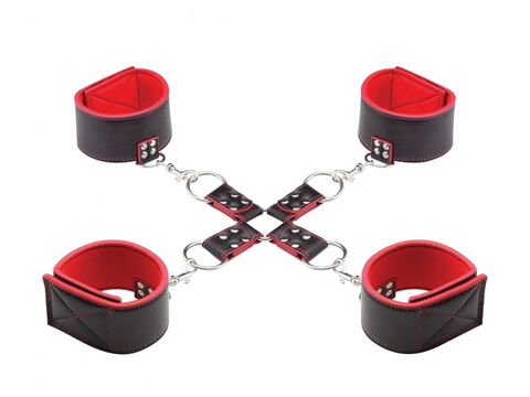 Манжеты этого фиксатора имеют полиуретановую и неопреновую стороны, это позволяет выбирать касающийся вашей кожи материал простым выворачиванием манжет на другую сторону. Неопреновая сторона цветная, а полиуретановая — чёрная, для придания грубости её внешнему виду! Они также снабжены застёжками-липучками, то есть они подойдут практически каждому. Система с карабинами для обеспечения взаимозаменяемости с другими бондажными игрушками. Материал - неопрен, полиуретан