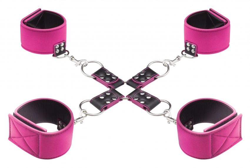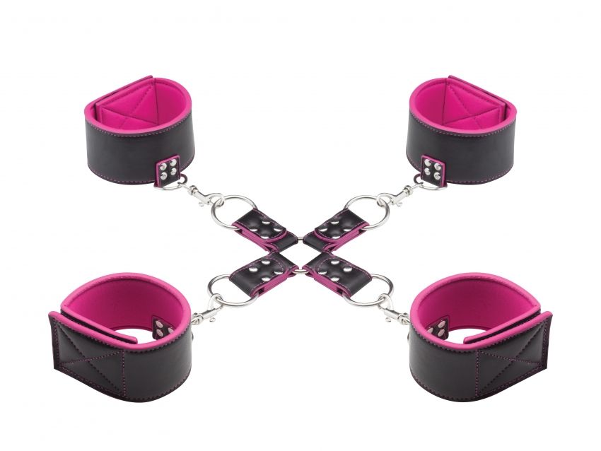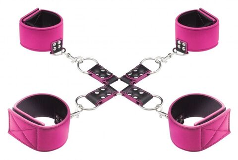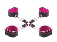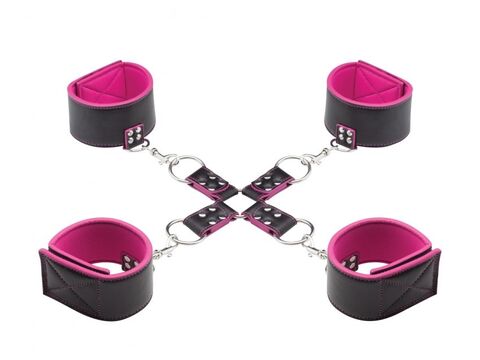 Манжеты этого фиксатора имеют полиуретановую и неопреновую стороны, это позволяет выбирать касающийся вашей кожи материал простым выворачиванием манжет на другую сторону. Неопреновая сторона цветная, а полиуретановая — чёрная, для придания грубости её внешнему виду! Они также снабжены застёжками-липучками, то есть они подойдут практически каждому. Система с карабинами для обеспечения взаимозаменяемости с другими бондажными игрушками. Материал - неопрен, полиуретан