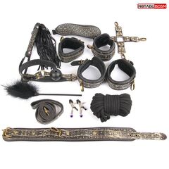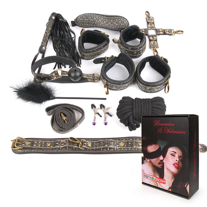 Великолепный набор аксессуаров для любителей БДСМ. В комплект входят наручники, оковы, ошейник с поводком, веревка, фиксатор, плетка, кляп, маска, зажимы для сосков, щекоталка. Кляп, наручники, оковы, ошейник и маска снабжены специальной внутренней накладкой, предотвращающей натирание кожи. Также изделия имеют возможность регулирования размера. Плеть-флоггер состоит из хвостов и удобной рукоятки с петлей. Зажимы для сосков имеют эластичные накладки, которые препятствуют сильному сдавливанию сосков. На каждом изделии предусмотрен регулировочный винт, позволяющий контролировать силу сдавливания сосков. Подвески дают небольшой эффект утяжеления и украшают зажимы.Удобный кляп оснащен шариком с отверстиями для дыхания. Щекоталка состоит из тонкой ручки и густого пушка. БДСМ аксессуары выполнены в черно-золотой цветовой гамме и украшены звездами. В комплекте: наручники, оковы, ошейник с поводком, верёвка, фиксатор, плётка, кляп, маска, зажимы для сосков, щекоталка.
