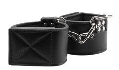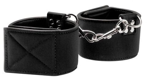 Одна из сторон этих наручников полиуретановая, а другая — неопреновая, и это позволяет выбирать касающийся вашей кожи материал простым выворачиванием наручников на другую сторону. Неопреновая сторона цветная, а кожаная — чёрная, для придания грубости её внешнему виду! Они также снабжены застёжками-липучками, то есть они подойдут практически каждому. Материал - полиуретан, неопрен.