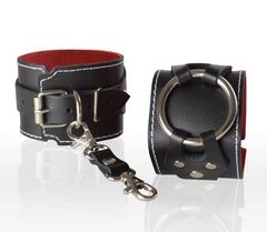 Чёрные кожаные наручники-напульсники с красной изнанкой.