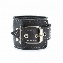 Наручники выполнены из черной натуральной кожи с белой контрастной строчкой. Надежно фиксируются на запястьях ремешками, которые позволяют выбрать нужный размер, подходят на обхват руки от 16 до 25 см. Металлическая пряжка крепко удерживает в подчинении, кожаное соединение на карабинах фиксирует наручники вместе. Мягкий подклад обеспечивает комфорт, помогая полностью погрузиться в БДСМ игру. Ширина - 6 см.
