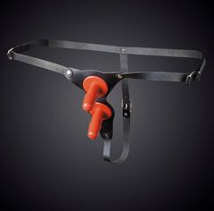 Страпон для двойного проникновения. В комплект входят два съёмных пластиковых плага для насадок. Изготовлен из натуральной кожи и никелированной фурнитуры. Размер универсальный.