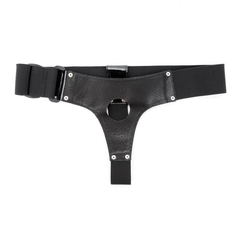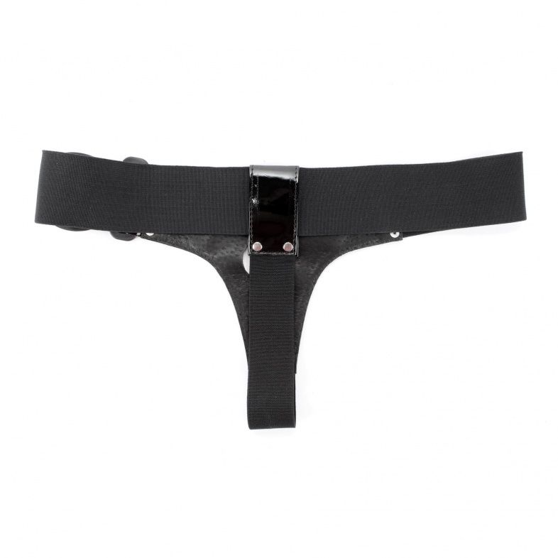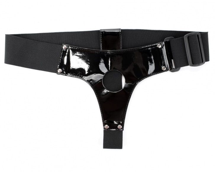 Трусики выполнены из лакированного кожзама черного цвета с элементами из черных эластичных резинок, надежно фиксирующих изделие на теле. Размер удобно регулируется, подойдет на 42-46. Максимально комфортный аксессуар разнообразит любую БДСМ игру. Диаметр отверстия для страпона - 4 см.