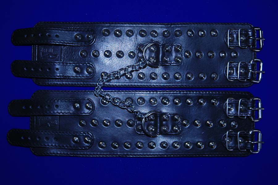 Наножники подшитые велюром, с декоративной строчкой, декорированные металлической фурнитурой, с фиксирующей цепочкой, со сварным D-кольцом, зафиксированным полосой и хольнитенами. Застежка 2 ремешка с пряжками. Длина фиксирующей цепочки - 14 см.