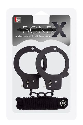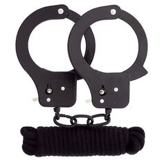 Чёрные наручники из листового металла в комплекте с веревкой BONDX METAL CUFFS&LOVE ROPE SET. Ключи в комплекте. Длина веревки - 300 см.