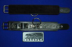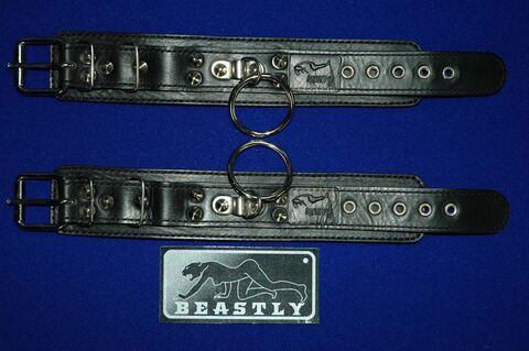 Наручники подшитые черным велюром, без соединительной фиксации. Прямоугольная база с центральным ремнем поверх базы. По центру наручников большое сварное D-кольцо, закрепленное металлической проушиной. Застежка, с регулирующим размер ремешком, закрепленным по краям базы. Ширина - 4 см.
