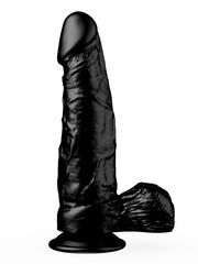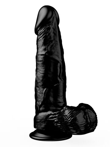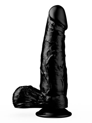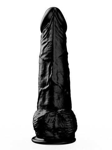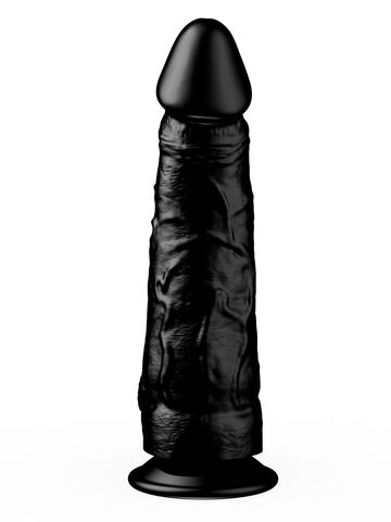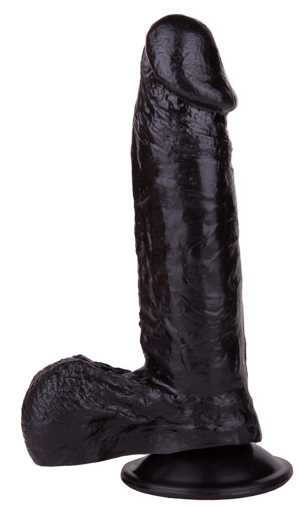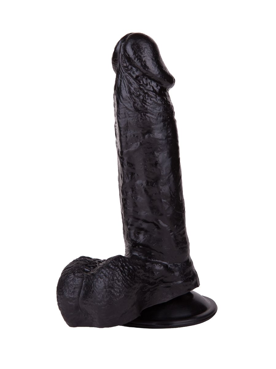 Чёрный-чёрный податливый ствол из упругого материала, покрытый тонкими венками… Крупная, чётко очерченная головка и большая мягкая мошонка… Глядя на эту реалистичную игрушку, невозможно удержаться от соблазна и не попробовать её ласк.