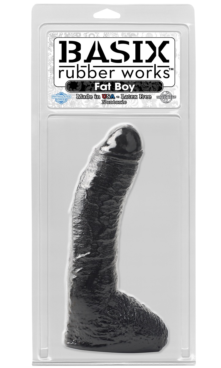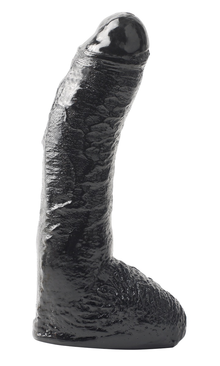 Большой толстый фаллоимитатор из пвх черного цвета. Плоское основание позволяет стоять фаллосу на плоской поверхности.