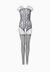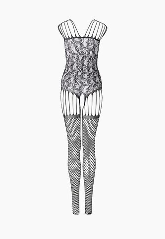 Чёрный комбинезон с ажурной верхней частью. С интимным доступом. Нежный, приятный на ощупь материал позволит вам чувствовать себя комфортно, а уникальный дизайн модели не даст отвести от вас взгляд. Благодаря уникальному пошиву и дизайну боди-комбинезон визуально стройнит фигуру, а также подчеркивает все самые аппетитные части тела. Трусики не входят в комплект!