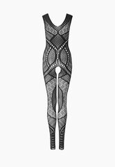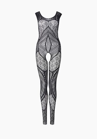 Чёрный комбинезон со сложным геометрическим узором. С интимным доступом. Нежный, приятный на ощупь материал позволит вам чувствовать себя комфортно, а уникальный дизайн модели не даст отвести от вас взгляд. Благодаря уникальному пошиву и дизайну боди-комбинезон визуально стройнит фигуру, а также подчеркивает все самые аппетитные части тела. Трусики не входят в комплект!