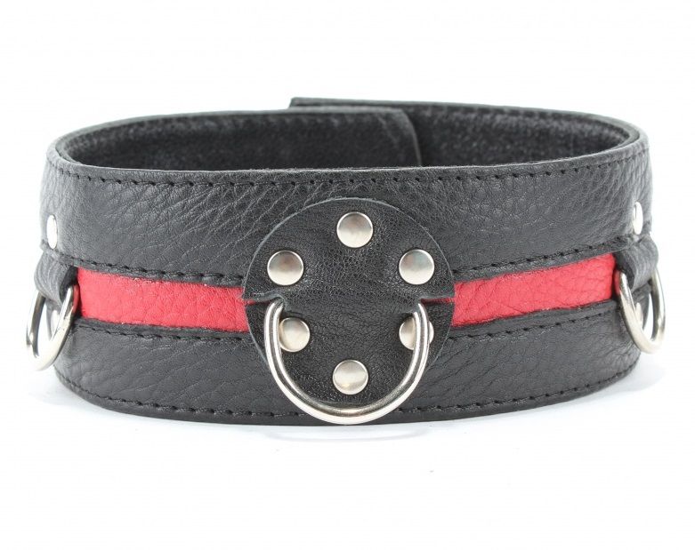 Ошейник выполнен из натуральной кожи черного цвета, декорирован вставкой из красной кожи, заклепками, тремя металлическими полукольцами. Ремень позволяют выбрать нужный размер, подойдет на обхват от 36 до 44 см. Металлическая пряжка надежно фиксирует аксессуар, подклад из нежной кожи обеспечивает комфорт. Стильный аксессуар поможет воплотить эротические фантазии в реальность.