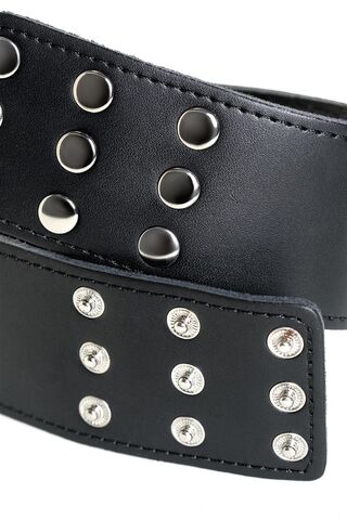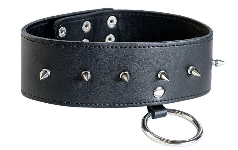 Ошейник из мягкой черной кожи. Декоративные шипы и металлические кнопки придают агрессивность. Размер регулируется 3 рядами кнопок.