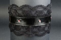 Подшитый; кожа лак и кружева – черные, застежка - кнопка, с 5 красными стразами.
