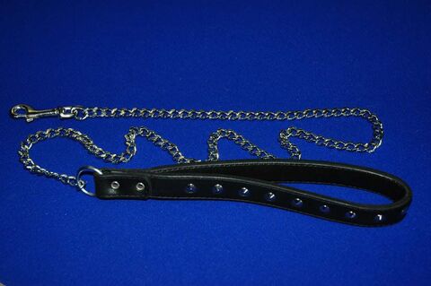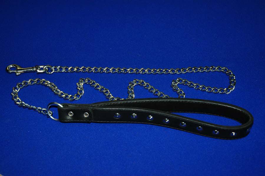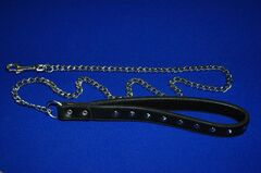Поводок цепной. Прошитый и клепанный; хромированная цепь с карабином и кожаная рукоятка-петля, декорированная металлической фурнитурой.