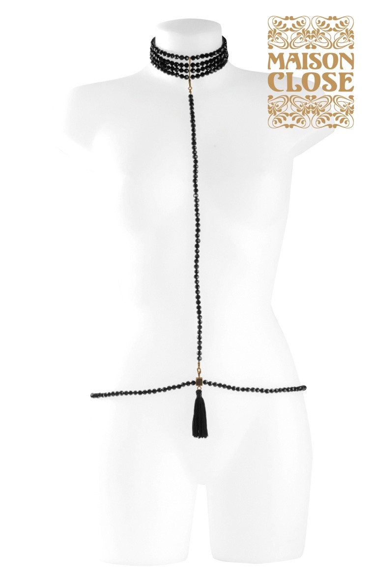 Пояс с кисточкой на конце соединенный с завязкой на шею. Все детали отстегиваются и могут использоваться отдельно. Изысканный аксессуар состоит из стеклянных бусин черного цвета. Коробка в стиле французского шика плюс каждая деталь завернута в упаковочную бумагу с логотипами. Длина пояса регулируется и может достигать 100 см в обхвате.