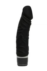 Вибромассажёр черного цвета. Имеет форму члена. Необычайно приятный, рельефный, выполненный из высококачественного силикона , передающий эффект мягкой реалистичной текстуры кожи, не имеет швов. Виброэлемент расположен по всей длине изделия. Вариации вибрации регулируются при помощи кнопки, расположенной в основании.
