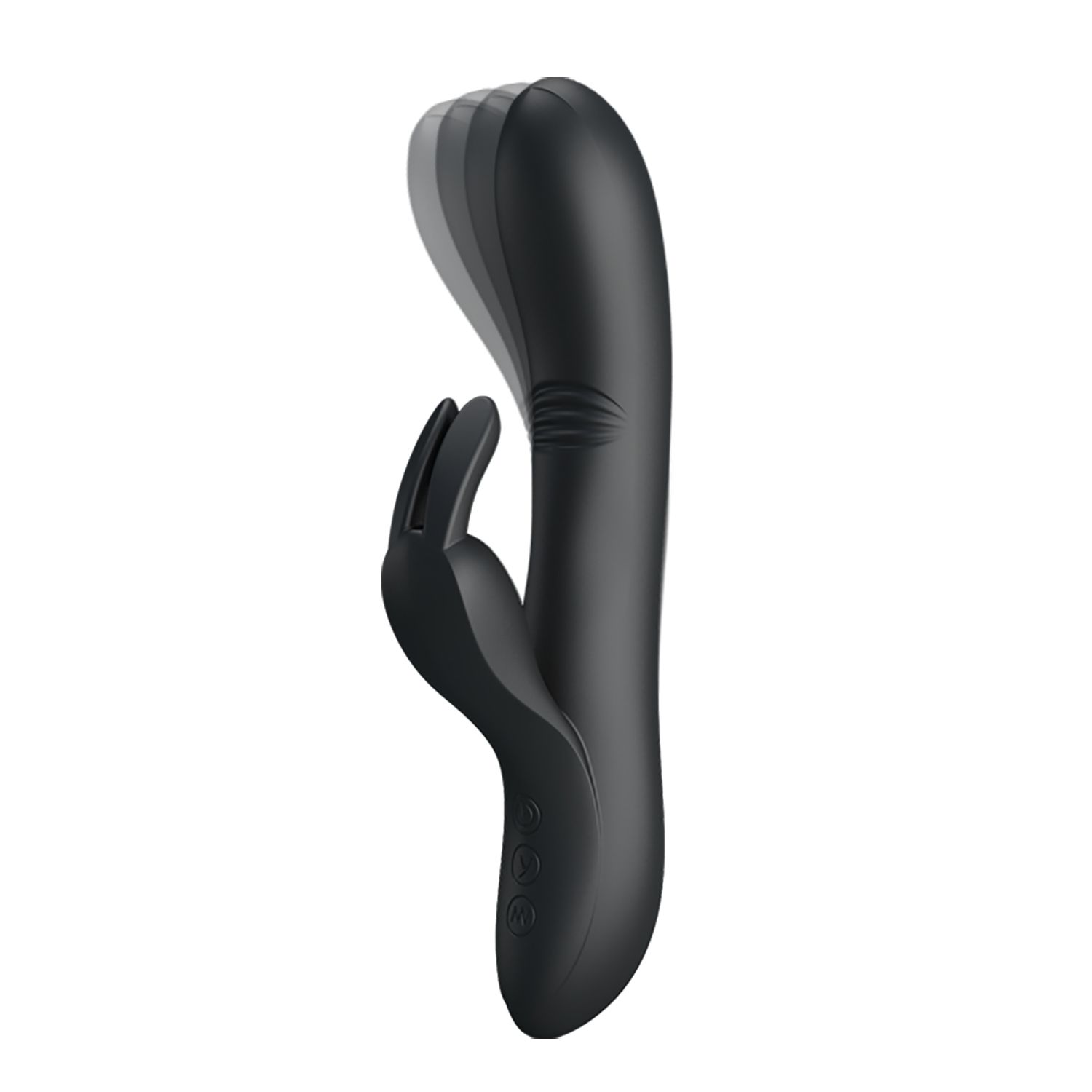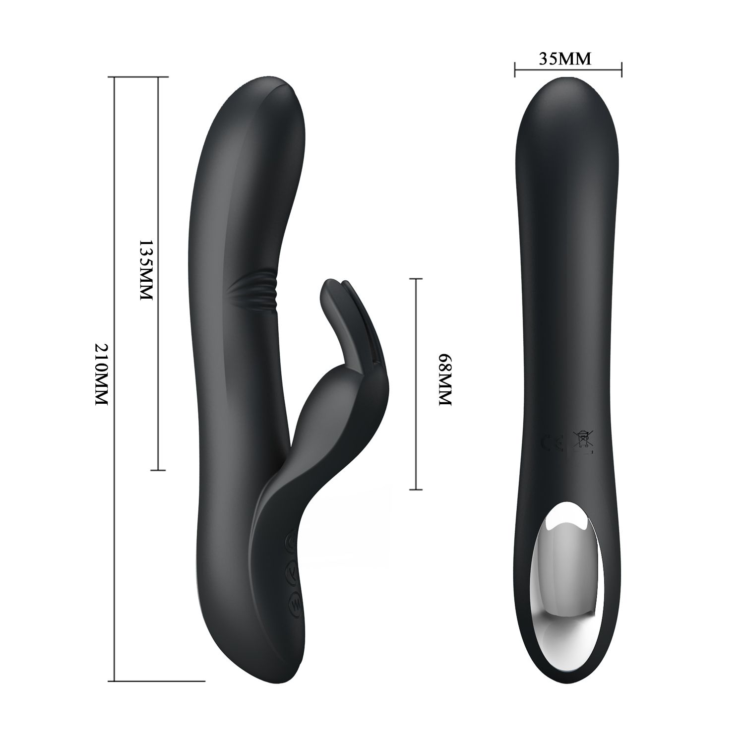 Силиконовый вибратор c клиторальным отростком в виде зайчика. Имеет 7 режимов вибрации и 4 режима, имитирующих стимуляцию пальчиком, лёгкое управление при помощи кнопок в основании. Имеет три моторчика.