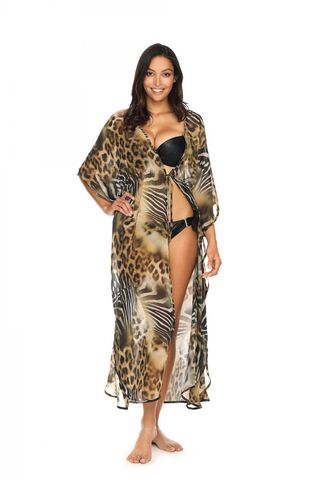Длинная пляжная туника-кимоно с анималистическим принтом. Ширина туники по талии регулируется кулисой с завязками спереди. Внимание: европейские размеры! Для определения российского размера необходимо прибавить 6!