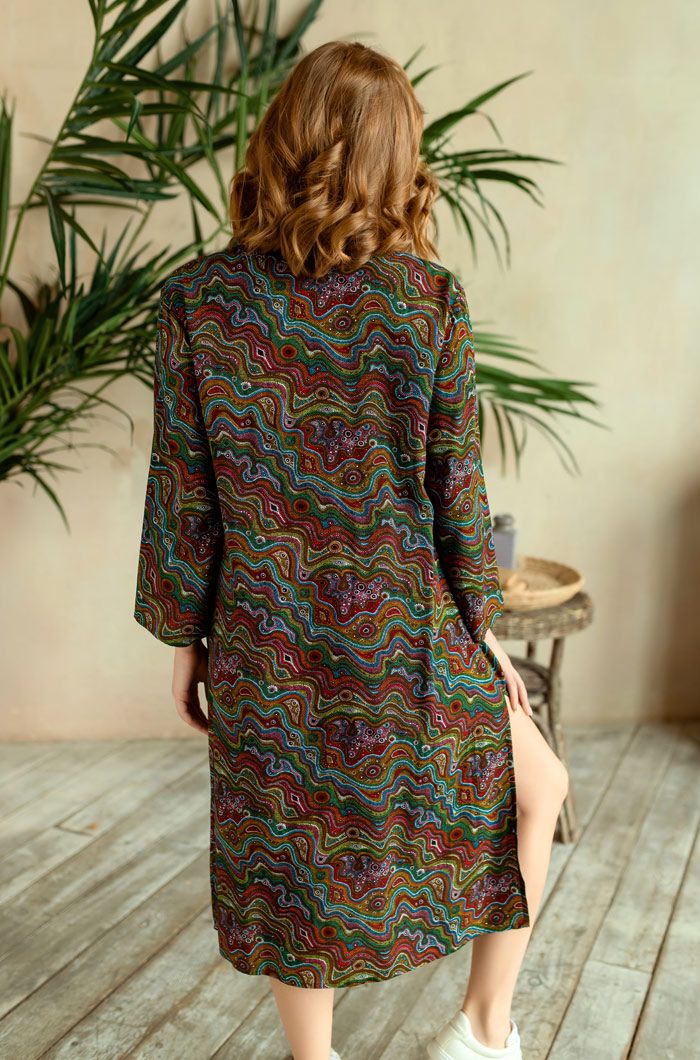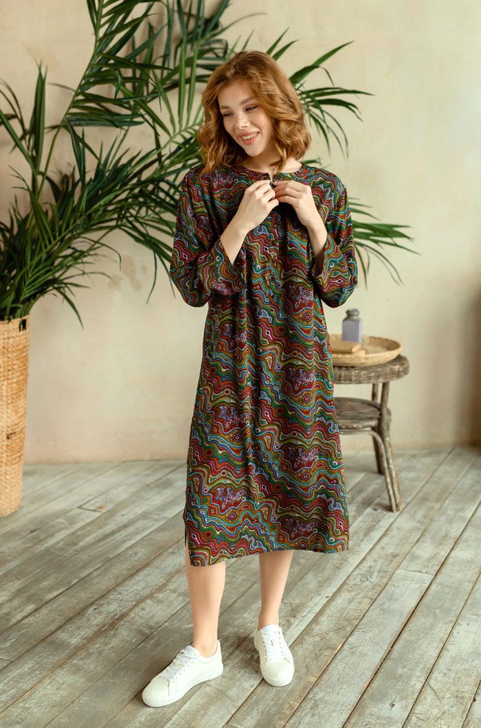 Длинная туника прямого силуэта с круглым вырезом горловины на полочке и спинке из принтованной вискозы. Модель с втачными широкими рукавами. Круглый вырез горловины полочки и спинки обработан притачной фигурной обтачкой. V-образный разрез на горловине полочки обработан притачной планкой. Планка туники застегивается на петли и обтяжные пуговицы из основной ткани.