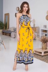 Длинное платье приталенного силуэта из принтованной вискозы на поясе. Высота лифа регулируется с помощью шнура по горловине. Разрезы по боковым швам.