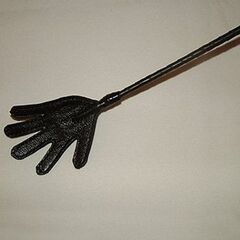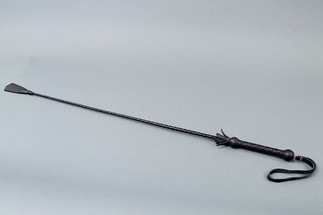 Стек состоит из гибкой основы, оплетённой натуральной кожей черного цвета,наконечника-ладошки и удобной рукояти с петлей для надевания на руку (темляк).